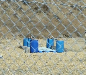 Here is something that appears to be two big blue boxes with PVC tubes sticking up from them. In the PVC tube is a pool noodle object, which appears to something like a pool noodle cross with plastic water bottles hanging from it that I’m sure sway in the wind and make noise because that is no small collection of water bottles. First off, I like the idea of the boxes and putting things in them like big balls that can be taken out and played with. Second, I like the idea of having an upright PVC pipe that a pool noodle can be slipped in and out of. Third, I like the idea of incorporating water bottle clumps because they are very sensory – make noise, reflect light, and move. This obviously requires a lot of horse desensitizaton!